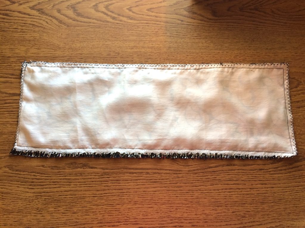 Cut your fabric into a rectangle that’s 20 inches long by 7 inches tall, then cut the same size rectangle from your lining fabric. Pin your lining to your outer fabric and sew around the perimeter using a ⅝” seam. Then finish all 4 edges with a zigzag stitch to keep it from raveling.