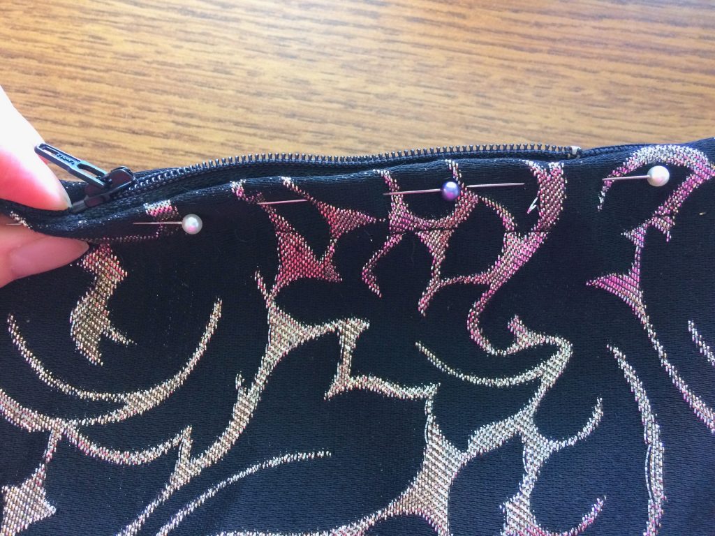 All that’s left is to sew the zipper! Pin your zipper and stitch along both edges of the purse to sew the zipper in place.