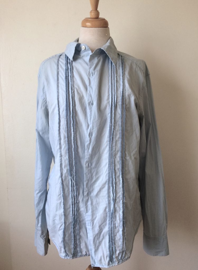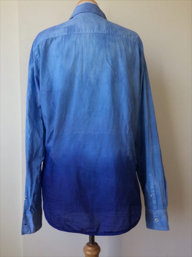 The first step is to choose and prepare your garment. White clothes work best, but a light complementary color can work too. In my case, I chose a light blue shirt with the idea of ombre-dyeing a darker blue from bottom to top. (It’s okay if your garment is a little wrinkled because the dye bath will be soaking it either way!)