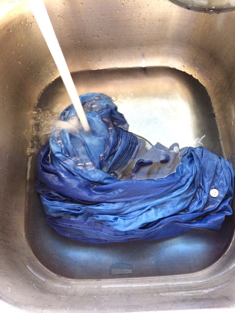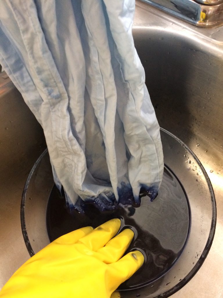 When you’ve achieved the intensity of color you want, it’s time to rinse your dyed garment. Remove it from the dye bath and rinse in cold water until the water runs clear. This step will inevitably get a very light but still noticeable amount of dye on the top half of your garment, so if you’re working with a white shirt that you want to keep white on top, don’t immerse your whole garment in the rinse water until the dyed half has rinsed clear.