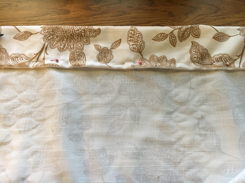 The next step is creating the long pocket. Take the diameter of your curtain rod and add 3 inches, then fold over the top edge of your fabric to that length. For example, my curtain rod is 1 inch in diameter, so I folded over my top edge 4 inches. Pin the long pocket in place.